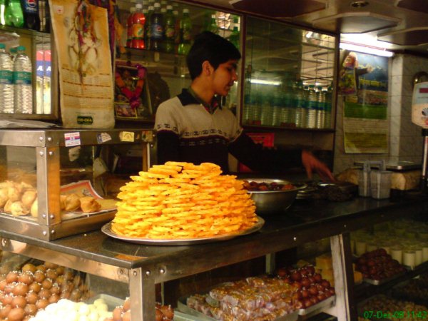 定食是Thali, 都是辣翻天的食物,就像自助餐端上盤一樣,裡頭有薄餅,米飯,吃到噴淚的咖哩(不是太好吃,是太辣了),優格.洋蔥等生菜…我還是覺得Nepal的Dal balt好吃(可能是因為有肉吃..哈..)基本上我還是不太能適應印度的傳統食物,一進德里,就天天去肯德雞報到.吃蛋捲冰淇淋啦.