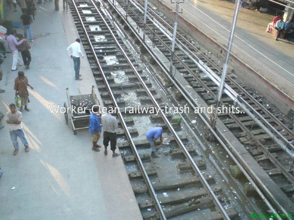 由於印度火車的排泄物是直接下放到鐵軌上,侯車時,偶有清潔工在清理鐵軌,站在3層樓高的月台上,那陣濃濃的屎尿味真是噁心噗鼻到無以復加...無法形容..
